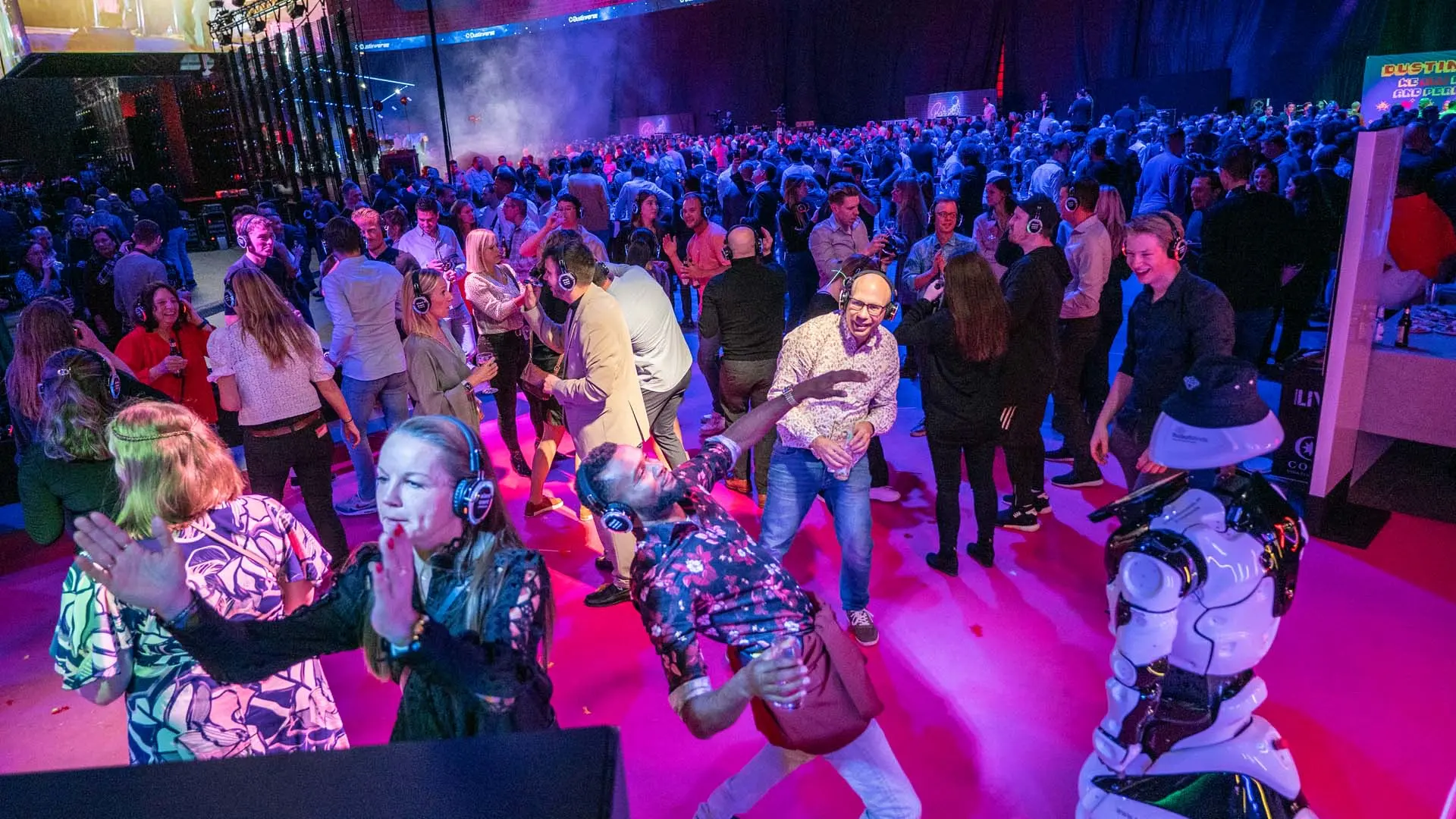 Den sista delen var ankomsten till rymden aka ”The Dustinverse”. Eftersom huvudmålet med denna upplevelse var att samla alla, erkänna och fira de framgångar som gjorts under de senaste åren, behövde vi lägga till den framåtlutande smaken till den. För att underlätta detta organiserade vi fyra aktiveringsområden kallade "The Four Supernovas of Dusrtin", var och en med olika teman baserat på företagets värderingar. Avsikten var att skapa ett naturligt utrymme för människor att mötas och umgås. Dessutom, eftersom Dustin är stolt över att vara ledande inom innovation, inkorporerade vi också robotar i sammankomsterna. Dessa robotar serverade inte bara mat och dryck utan dansade också och bidrog till den totala upplevelsen.